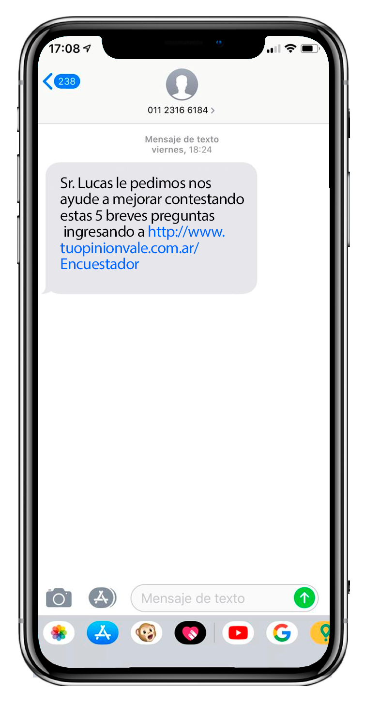 Para contactarnos con los encuestadores le enviamos un SMS solicitando a la persona que por favor ingrese al Chat que le corresponde segun la Encuesta a Contestar. Este SMS puede ser personalizado si en la base que nos proveen nos indican el nombre del titular de la línea a contactar.